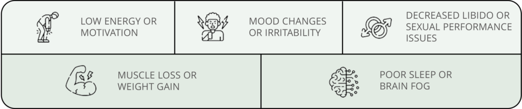 Men sometimes put off healthcare until symptoms interfere with daily life. Whether you’re struggling with fatigue, stress, weight changes, sexual health concerns, or simply don’t feel like yourself, we’re here to help. Our integrative care plans combine advanced testing, lifestyle guidance, and personalized treatment to support: